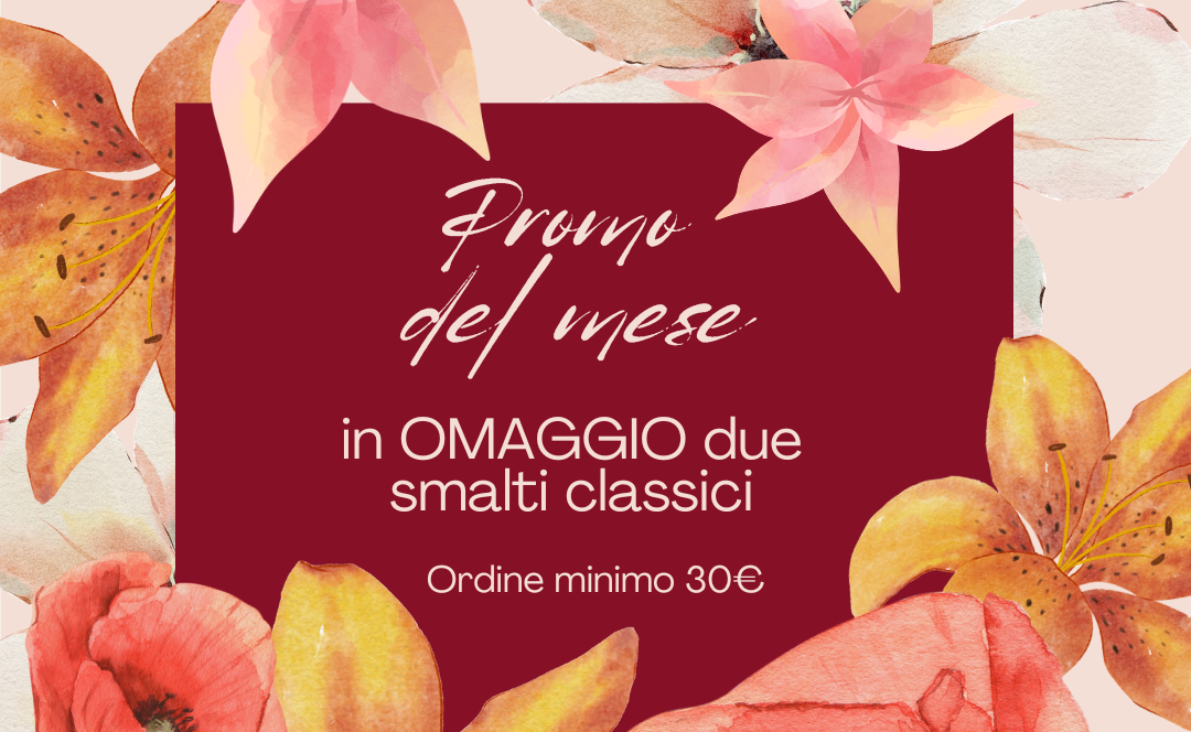 Effettua un ordine minimo di 30€ riceverai in OMAGGIO due smalti classici. Promo valida fino ad esaurimento scorte. Le spese di spedizione sono escluse. I colori dell'omaggio saranno casuali.