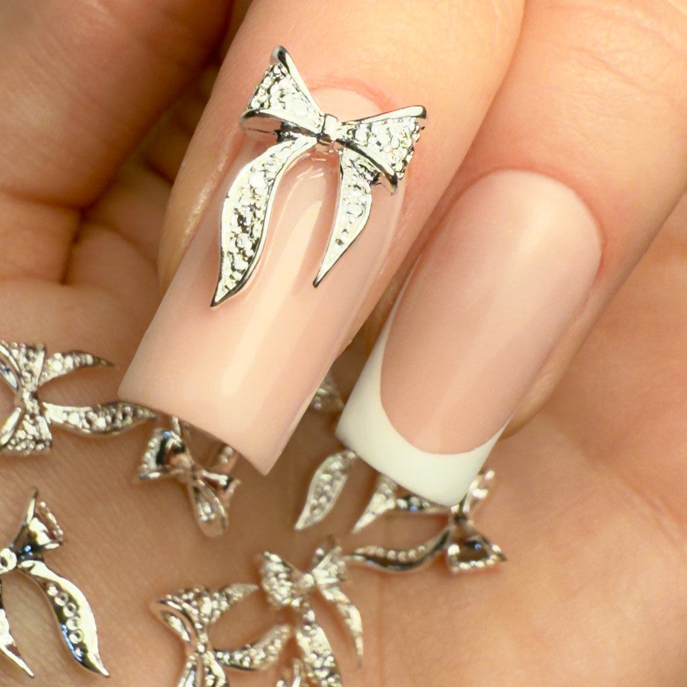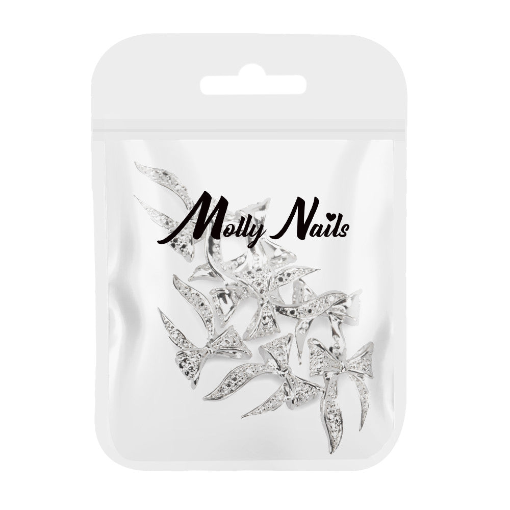 La confezione contiene fiocchi di colore argento, hanno una base di appoggio piatta per farli aderire meglio alla superficie dell'unghia.